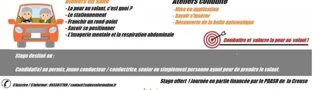 Des fevrier 2026, Salesse Formation : Auto-Moto école, accompagnée de l’ IPCSR Christelle Mavigner et d’un hypnothérapeute ( centre-regional-hypnose.fr), vont organiser, plusieurs stages pour » combattre l’amaxophobie » !